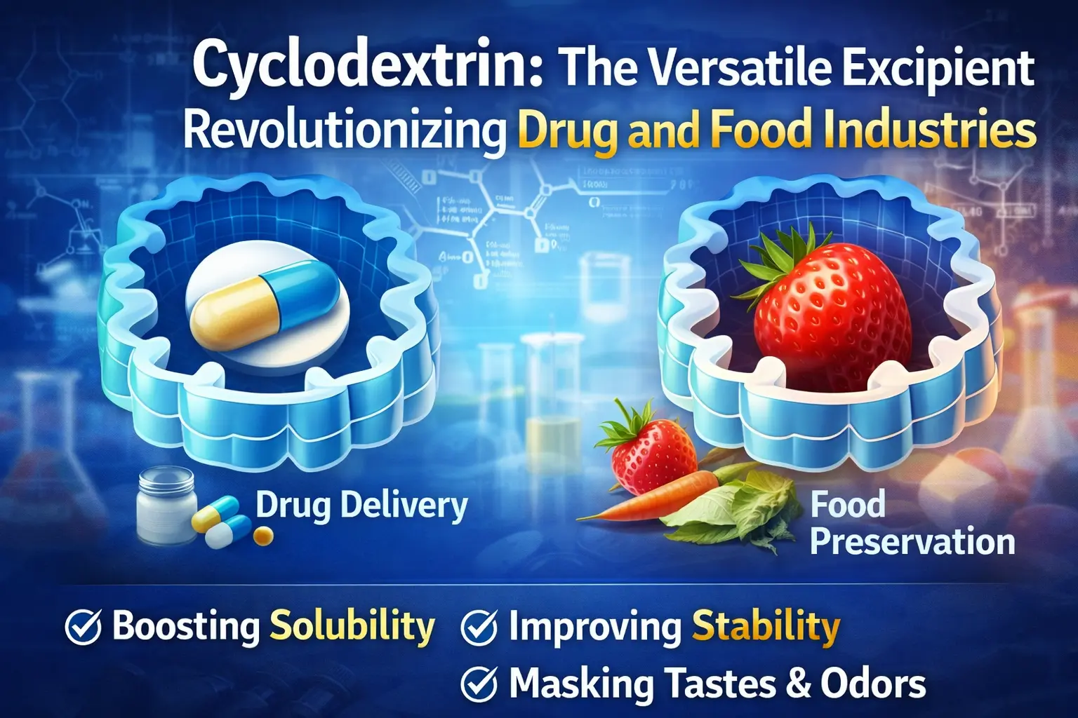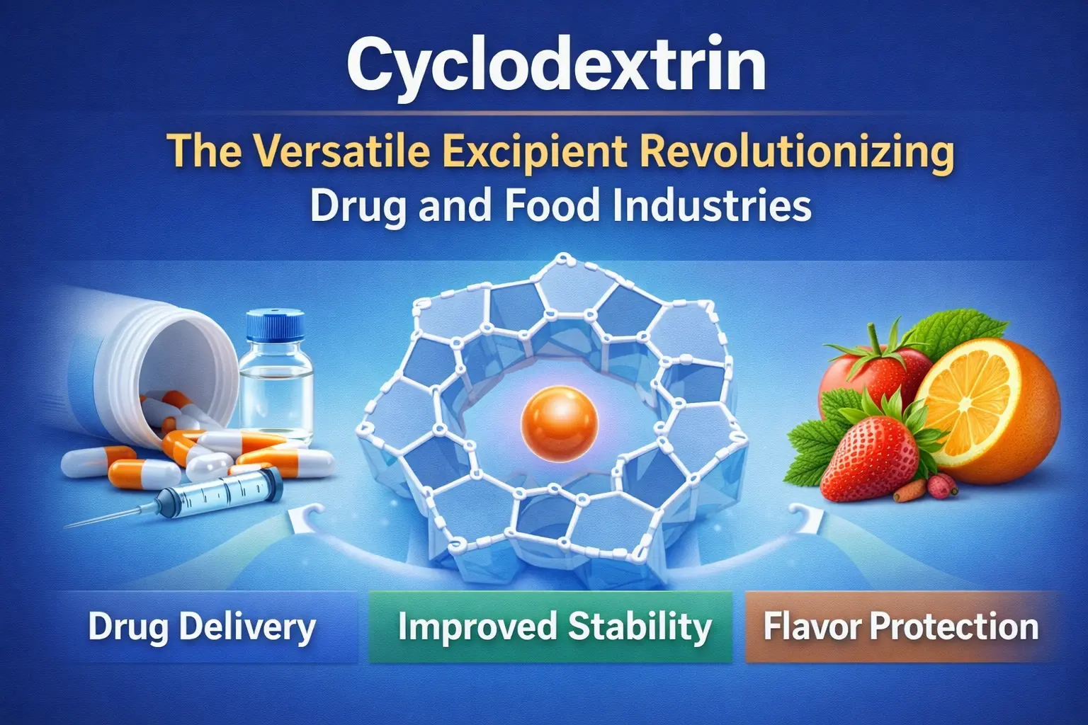 シクロデキストリンの発見は、食品と医学の歴史において最も重要な前進の 1 つです。この天然に存在する環状オリゴ糖は、医薬品の配達方法、食品の鮮度保持方法、および産業における他の多くの化学物質の使用方法を変えました。このプルダクトは、疎水性の内部空洞と親水性の外表面を有する独特の分子構造のおかげで、多くの分野で重要な問題に対処する包接錯体を生成します。この柔軟な賦形剤は、世界中の製剤科学と製造プロセスを変えています。薬物の吸収を改善することから、薬の不快な味を隠すことまで、あらゆることができます。