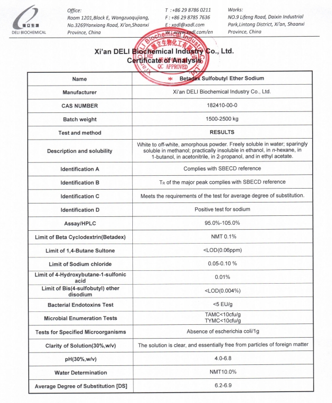 この注射用グレードのスルホブチル エーテル ベータ シクロデキストリン ナトリウムは、包括的な品質管理システムの下で製造されています。同定、分析、平均置換度、残留不純物、エンドトキシンレベル、微生物制限などの主要な品質特性が厳密に管理されています。